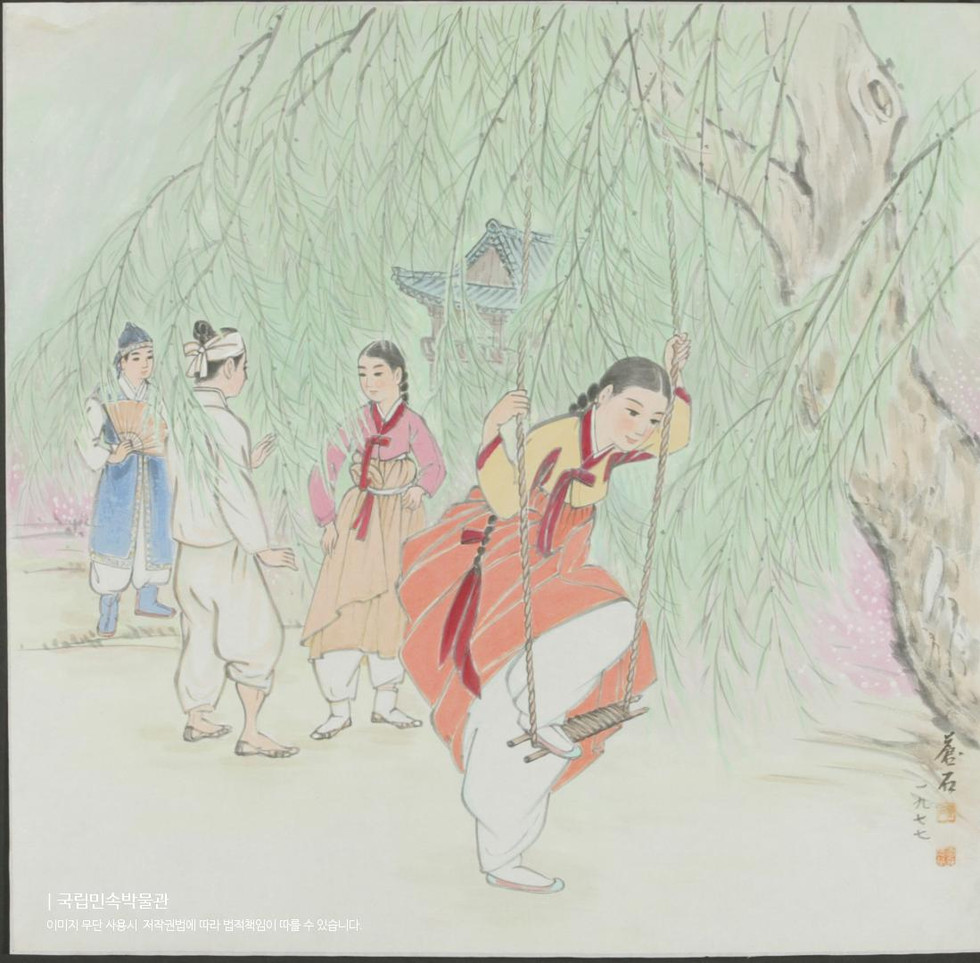 사실 문학 속 놀이가 등장하는 건 최근 일이 아닙니다. 우리 모두가 아는 판소리계 소설인 『춘향전』에서도 놀이가 나오죠. 춘향이가 광한루에서 그네를 뛰는 장면이 그렇습니다. 그네뛰기는 한국의 정서를 잘 보여주는 오랜 전통을 지닌 민속놀이입니다. 18세기의 시인 신광수와 소설가 계용묵은 조선의 정서를 가장 잘 보여주는 놀이가 그네라고 강조합니다. 그들은 그네뛰기는 여성의 놀이로써, 그네를 타는 풍경이야말로 조선 여성들만이 보여줄 수 있는 유희적 매력과 심미적 쾌감을 마음껏 발산시키는 한 편의 시와 같다고 했습니다. 또한 조선다운 아름다움을 보여주는 특색이 여성의 그네뛰기에 있음을 발견하고 이를 찬미한 글을 쓰기도 했습니다. 『춘향전』에서 춘향이의 매력과 아름다움을 표현하기 위해 그네를 뛰는 장면을 넣은 것이죠.